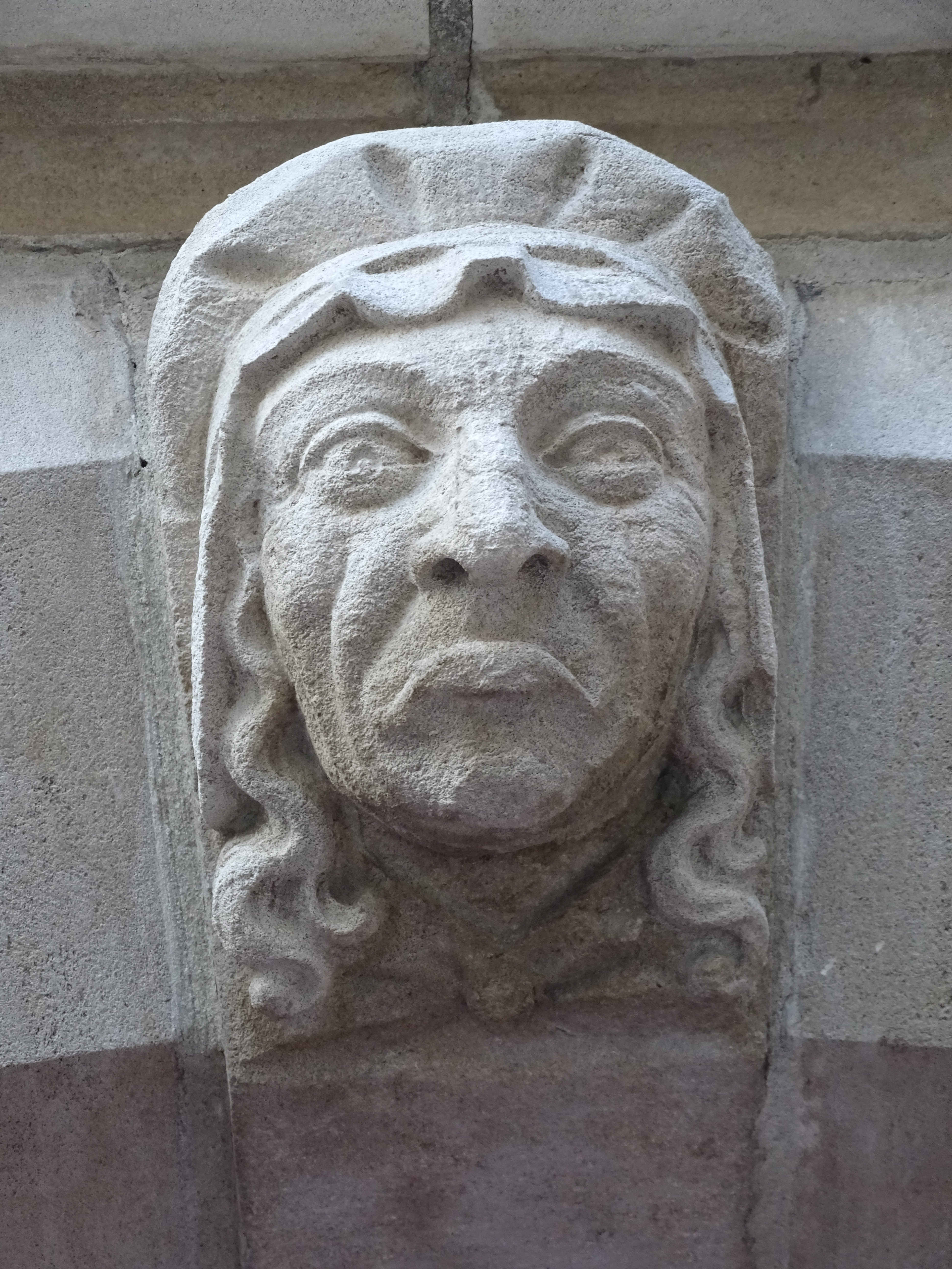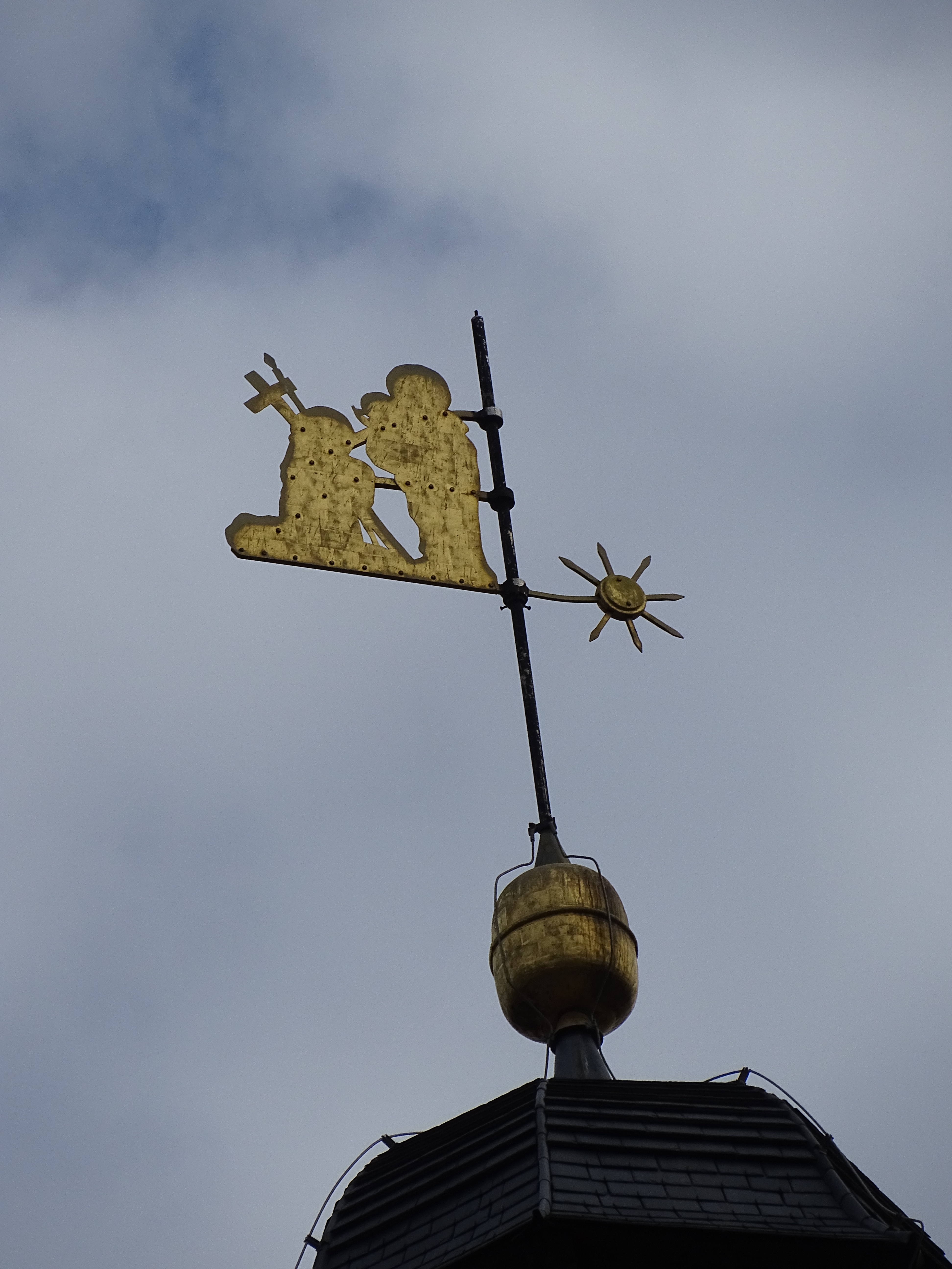 There is something special about becoming intimate with a city you love: as it learns to trust you, it reveals details you failed to notice during your first or second visit. And so one architectural detail leads to another, and you are guided down unfamiliar streets where you discover treasures that don’t feature in glossy tourist books: the mascaron with a grumpy woman that could be me on a Tuesday morning, once I’ve realised that, this week, too, I will fail to achieve everything on my to-do list. Above a brasserie, a terracotta man holding a something we can’t make out. A lantern? A bell? I focus the zoom lens of my camera on him. It’s a tankard of beer. Of course, what else? On top of a gable in Jan Van Eyckplein, a stone cat holds a fish in its mouth. And, on our way to Dammerport, I come across my own favourite discovery: in the distance, a weather vane, as beautiful as many other weather vanes in Brugge, but with a difference – I can’t tell what it represents, even through my zoom lens. Human figures, one holding a child, perhaps – the other one kneeling? – a cross, a spear. The next day, I go in search of the building on top of which it stands. It’s a church on the grounds of the College of Europe. Private property. I appeal to a resident walking her dog. “Please,” I say, “may I come in just for a few seconds to take a picture?” She lets me through the barrier. “What does it represent?” I ask, but she doesn’t know.
