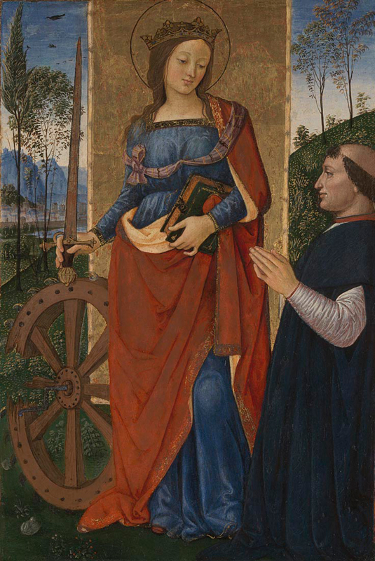 Paintings of Saint Catherine of Alexandria, on the other hand, are more suggestive and inspiring. My absolute favourite among them is by Il Pinturicchio, currently in storage at London’s National Gallery. A beautiful woman with a fresh complexion, wearing a dress of a stunning blue, and although she is holding a sword above a wheel – symbols of her gruesome martyrdom – in her right hand, there is a large leatherbound book with two clasps in her left. She looks down at the Donor who no doubt paid handsomely to be painted beside her in the Renaissance precursor to photobombing. There is a polite half-smile on her lips and an expression of mild benevolence on her face, although I sense a hint, a faint shade of weariness verging on boredom.