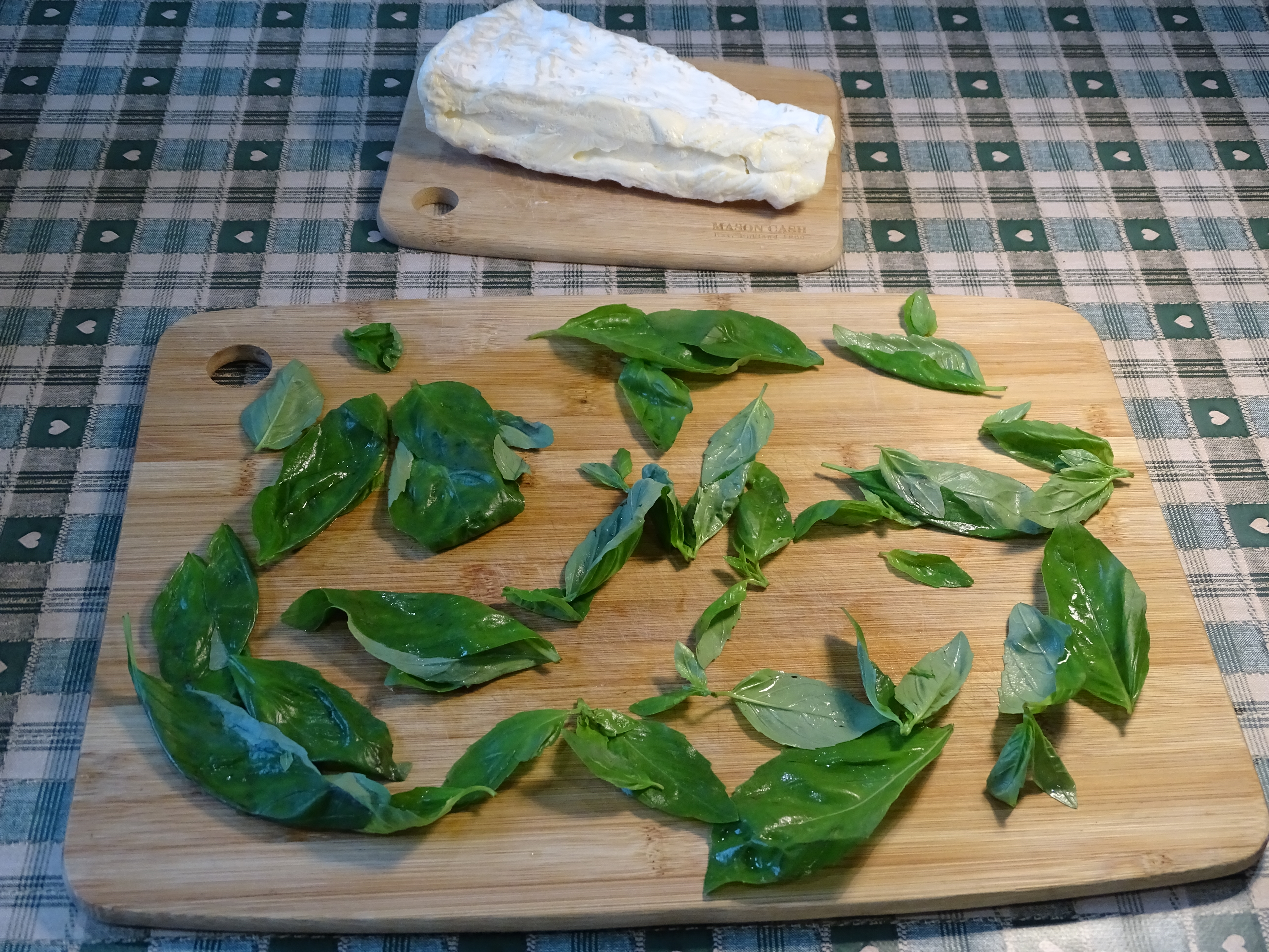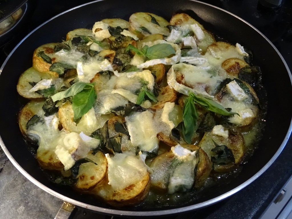 Once the potatoes have got a golden crust on them, take them out of the oven and scatter the shredded basil over them, then distribute the slices of Brie, making sure most of the potato and basil surface is covered. Uncovered basil is likely to turn black in the heat. On some days, I add a very, very light dusting of freshly-ground black pepper.