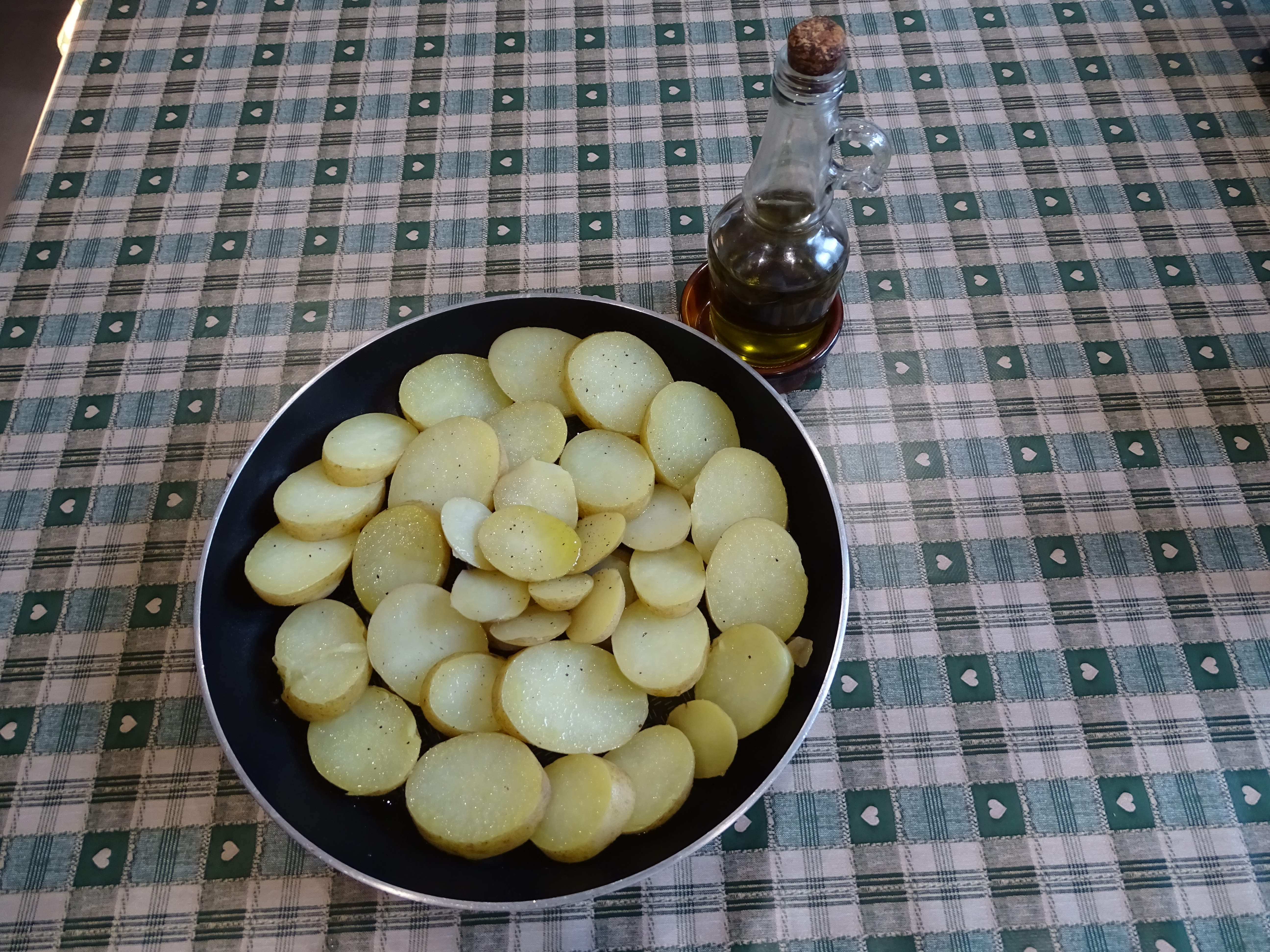 With a perforated spoon (to make sure the excess water drains), place each potato slice in an oven-proof dish previously drizzled with olive oil. How you arrange the potatoes is entirely a matter of personal preference. You can line them in rows, wind them in a spiral, form them into a flower, or however you please, depending on the size and shape of your oven-proof dish. A generous drizzle of olive oil on top, then slide the potatoes into the oven and wait for the edges to brown.