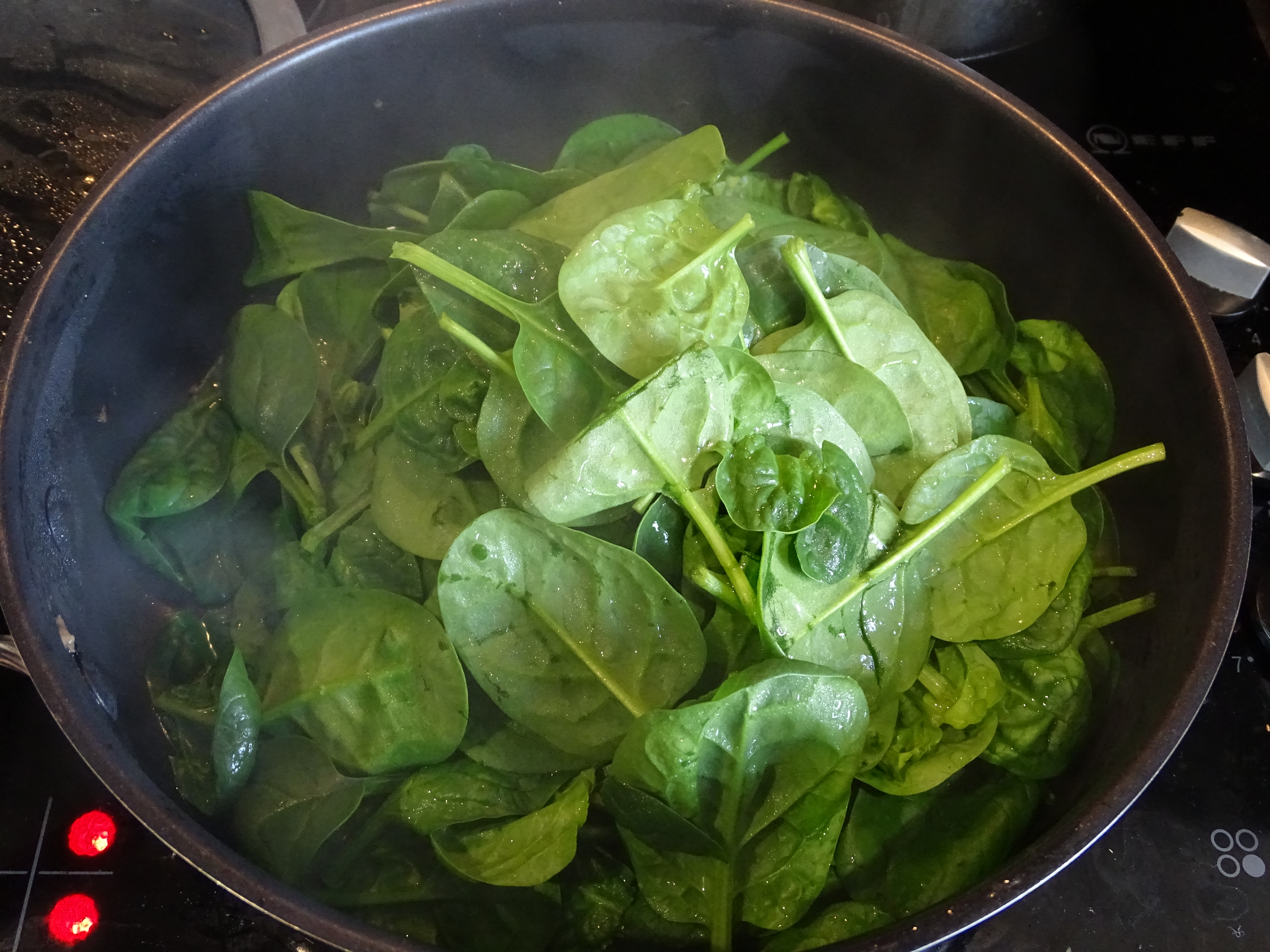 Wash the spinach thoroughly, drain the excess water, stew for a few minutes until wilted, then cut into tiny pieces with a knife and fork (or put into a blender).