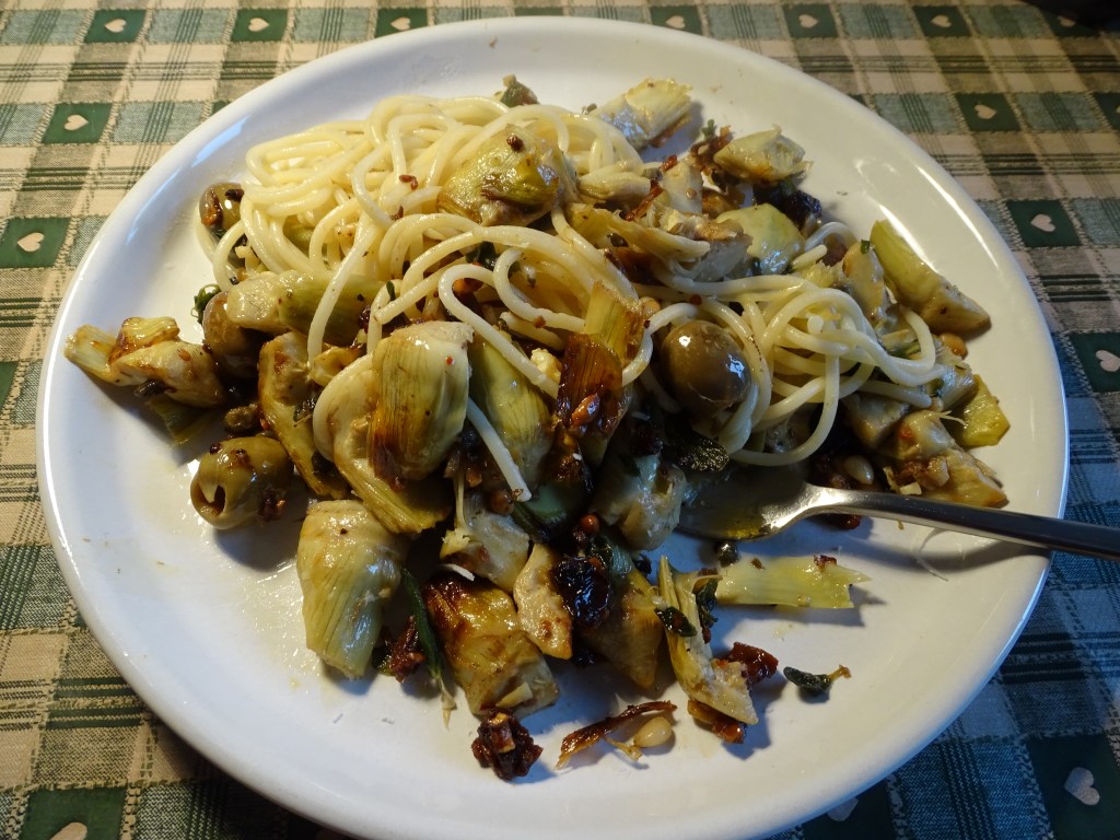 My favourite spaghetti dish is one I often make myself either when Howard is out, or when he makes his own plans for a meal. He doesn’t care for it. For one thing, he fails to appreciate my all-time favourite vegetable and empress of all thistles: the globe artichoke. Moreover, he isn’t very keen on chilies. So, when he is out at a jazz jam session, or making himself my all-time hated food, steak, I spoil myself with this scrumptuous composition.