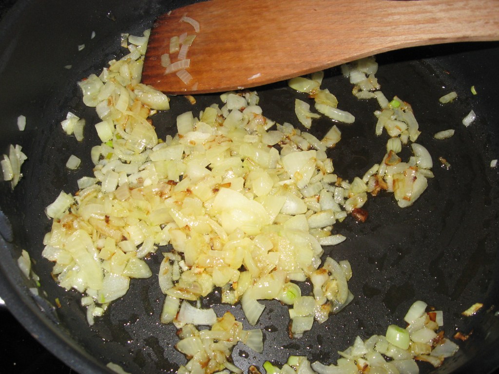 Since I do not own a large enough frying pan, I tend to fry all the vegetables separately and put them into a large saucepan as I go along, then add the raw potatoes, water and bay leaves before bringing it all to boil and cooking.
